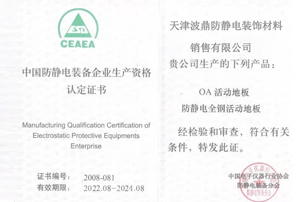 中國防靜電裝備企業(yè)生產(chǎn)資格認(rèn)定證書